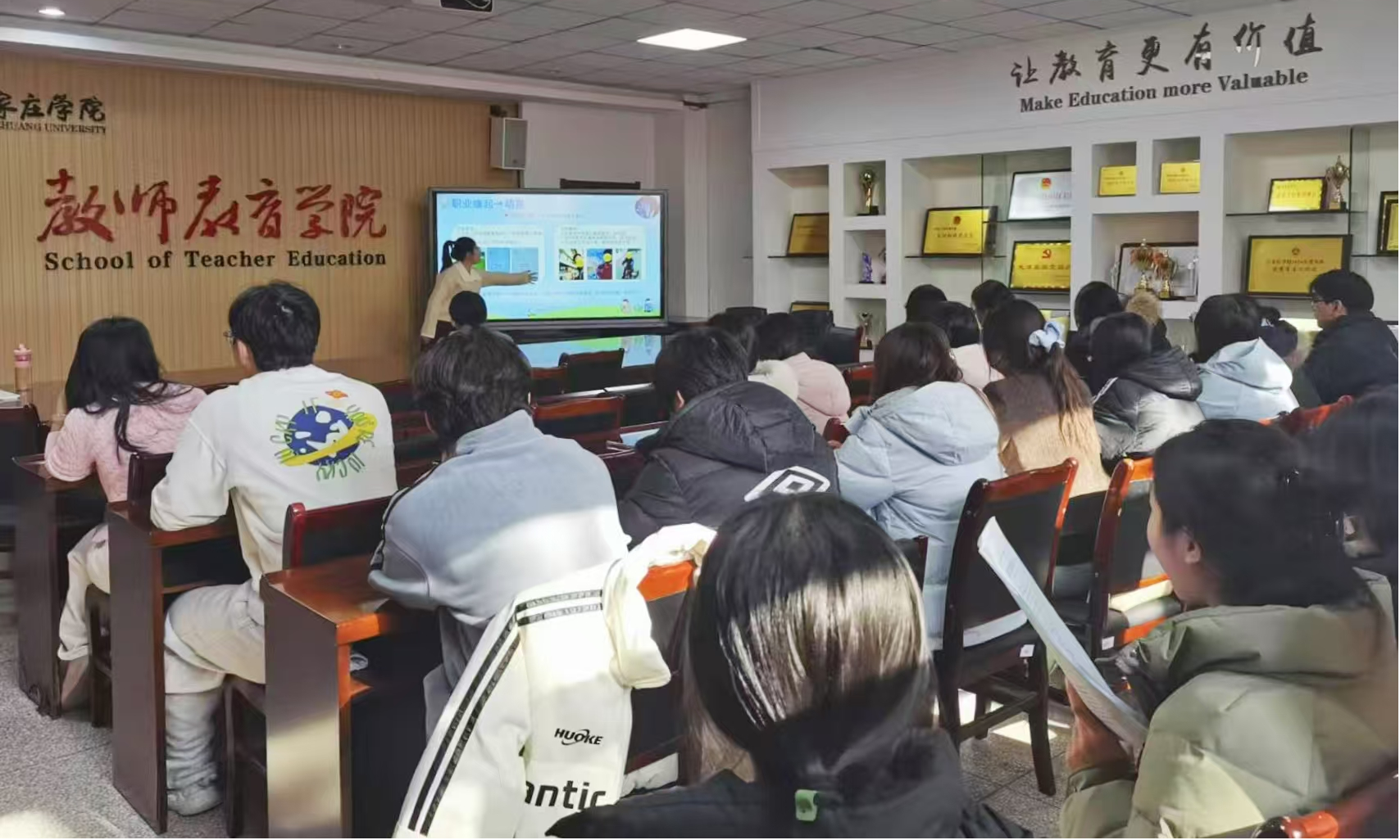 活动中,来自特殊教育、应用心理学、小学教育、学前教育专业的张艺文、靳高祥、孙诗萌、刘凯琪、孙嘉烁5名获奖学生,依次展示参赛作品,并围绕赛事规则解读、规划书撰写与现场展示技巧等方面分享实战经验,为同学们的职业规划与路径选择提供了具体借鉴。指导教师葛婧茹以《从“小白”到省赛:职业规划大赛备赛全流程》为题,结合省赛指导经历,深入解析“如何突出师范特色职业目标”“如何实现实践经历与规划路径紧密衔接”等关键问题,帮助同学们进一步把握赛事内涵、掌握备赛方法。