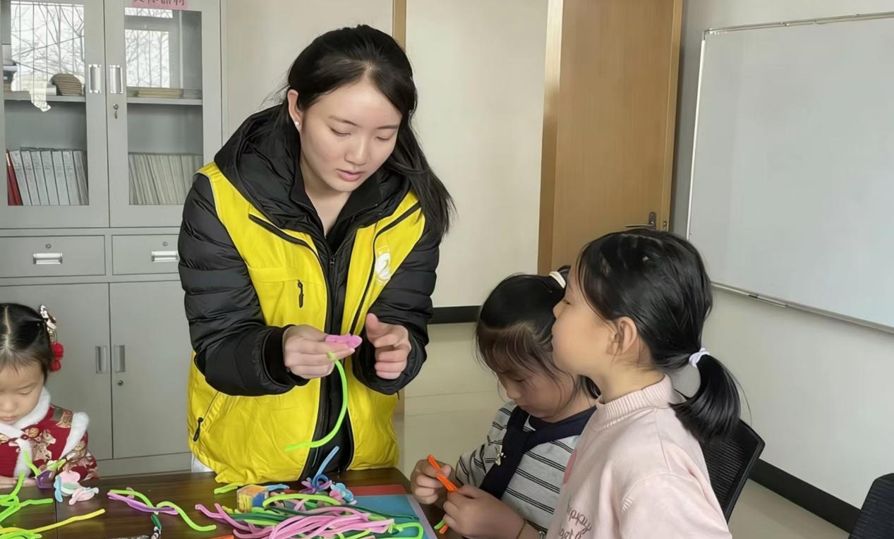 在社区活动室,学生志愿者们结合托管需求与师范专业特长,分区域带领孩子们开展春日主题手工创作。陪伴指导小朋友们发挥想象力,通过扭扭棒塑形、黏土揉捏、剪纸创作等方式,制作出栩栩如生、饱含童趣的花朵、蝴蝶、太阳等造型。在互动交流中,志愿者鼓励小朋友介绍自己的作品,并带领孩子们诵读春日诗词,让大家在手工创作的同时感受传统文化的韵味。