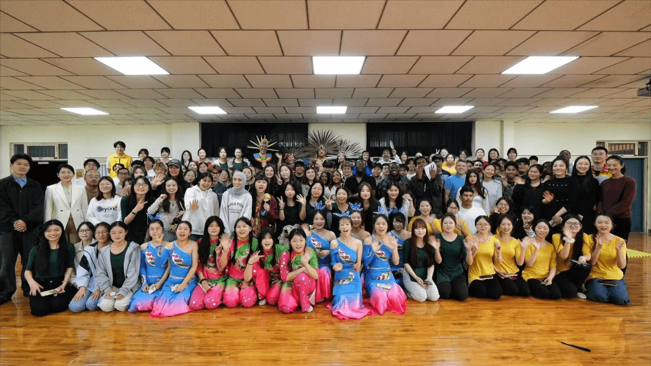 舞蹈交流环节中,我院专任教师程洁冉、刘蕾带领学生依次展示蕴含中华传统礼仪的礼仪操,以及蒙古舞、藏族舞、傣族舞等经典民族舞蹈,重点呈现东北秧歌、井陉拉花、地秧歌三种燕赵非遗舞蹈,详细讲解其风格差异与文化特色。学生志愿者李双颖、付晓宇、曹安靖、朱佳宁、王晨宇等担任现场翻译,并组织美国青少年参与秧歌“丢手绢”互动。美国交流团师生也登台献艺,带来墨西哥传统民俗表演,还深情演唱《月亮代表我的心》《青春修炼手册》等中文歌曲,现场歌声与笑声交织,中美青年携手共舞,气氛热烈。